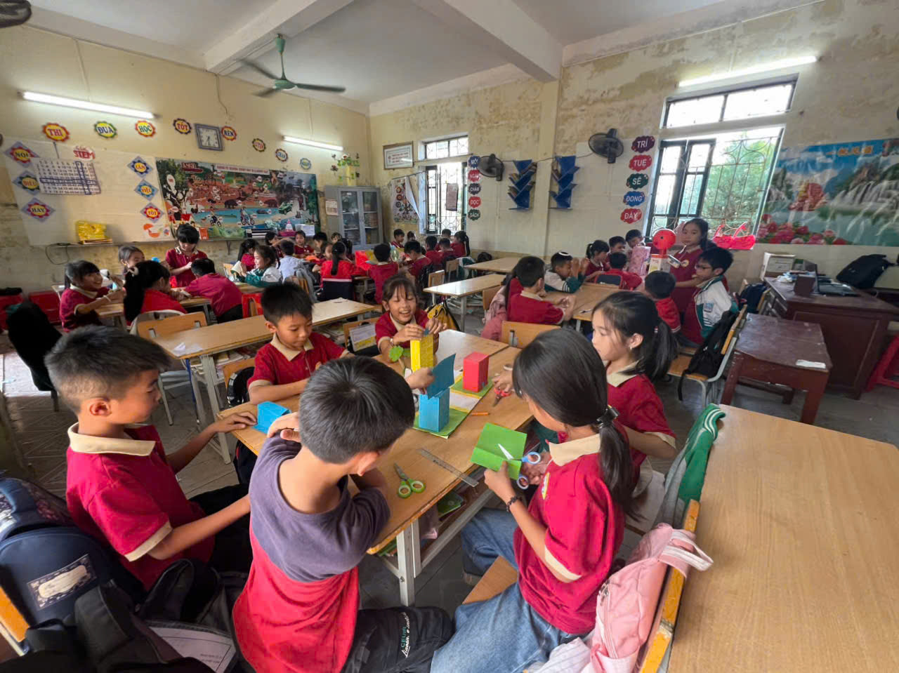 Ảnh 5: Học sinh lớp 3A vận dụng các hình khối để làm các sản phẩm trang trí lớp học