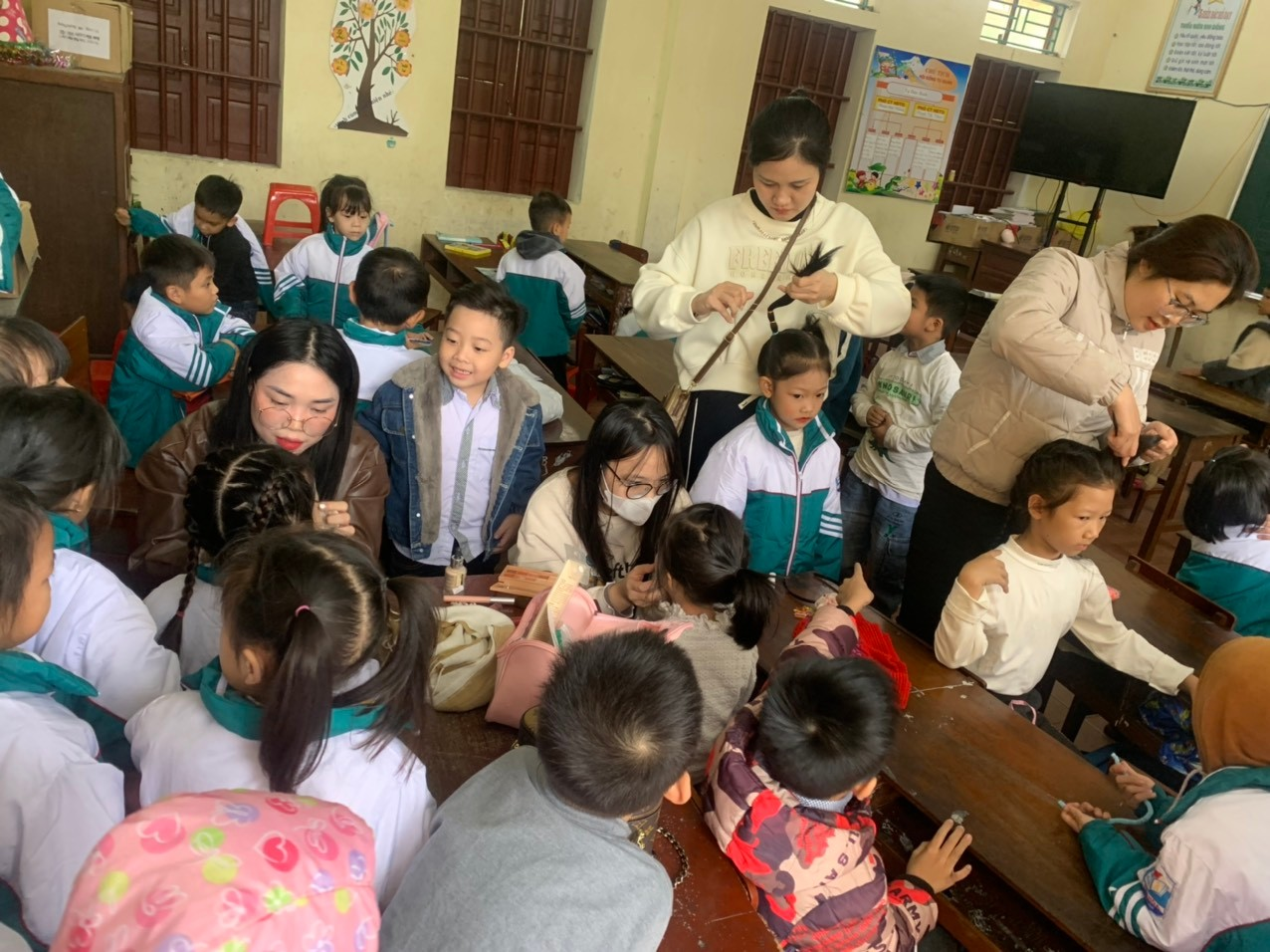 Ảnh 11, 12: Phụ huynh hỗ trợ trang điểm cho học sinh trước giờ biểu diễn.