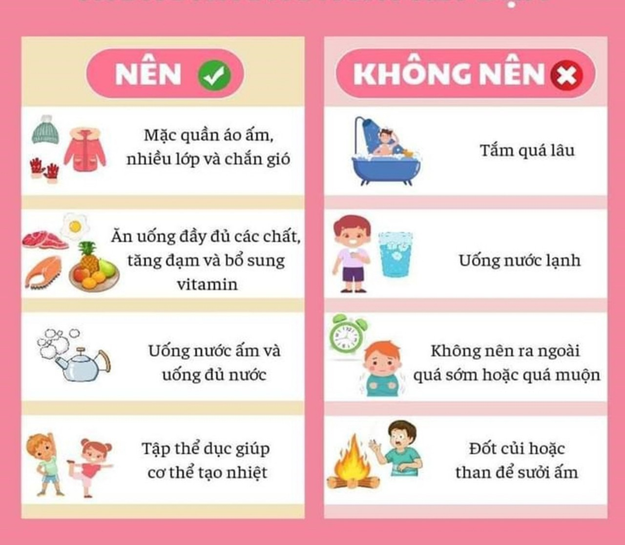 – Trang bị quần, áo đủ ấm cho trẻ khi ở nhà và khi ra ngoài, không ra ngoài khi không cần thiết.