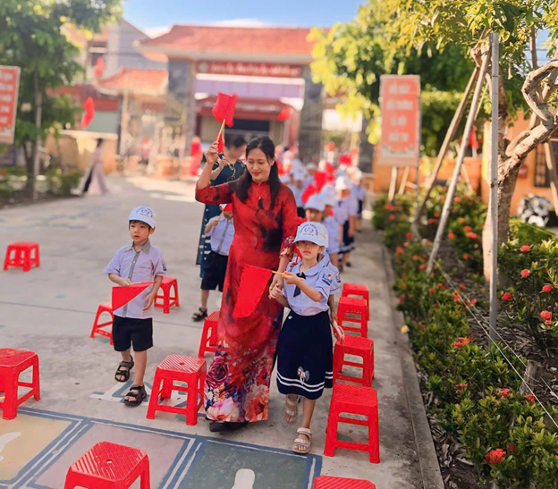 Ảnh 4. Cô giáo Phạm Thị Yên – Hiệu trưởng nhà trường đón các em học sinh lớp 1
