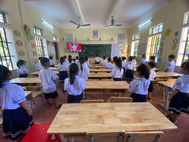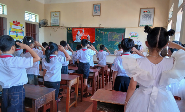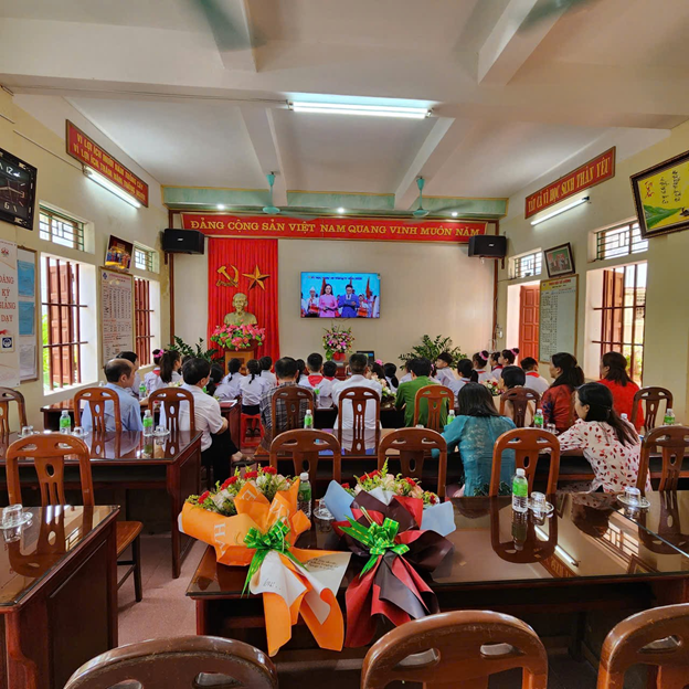 Khép lại Lễ Khai giảng tại sân trường. Đại biểu, cán bộ, giáo viên và đại diện học sinh các lớp về văn phòng nhà trường để dự Lễ Khai giảng trực tuyến Kỉ niệm 80 năm thành lập Bộ Quốc gia Giáo dục; các em học sinh còn lại dự Lễ Khai giảng trực tuyến tại lớp học.