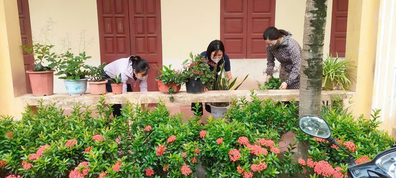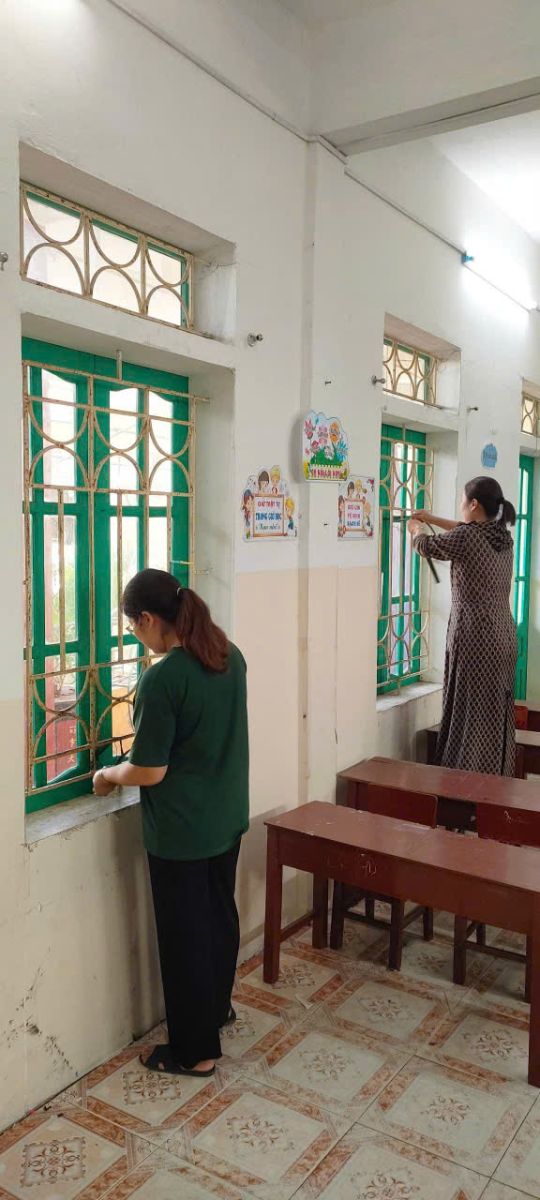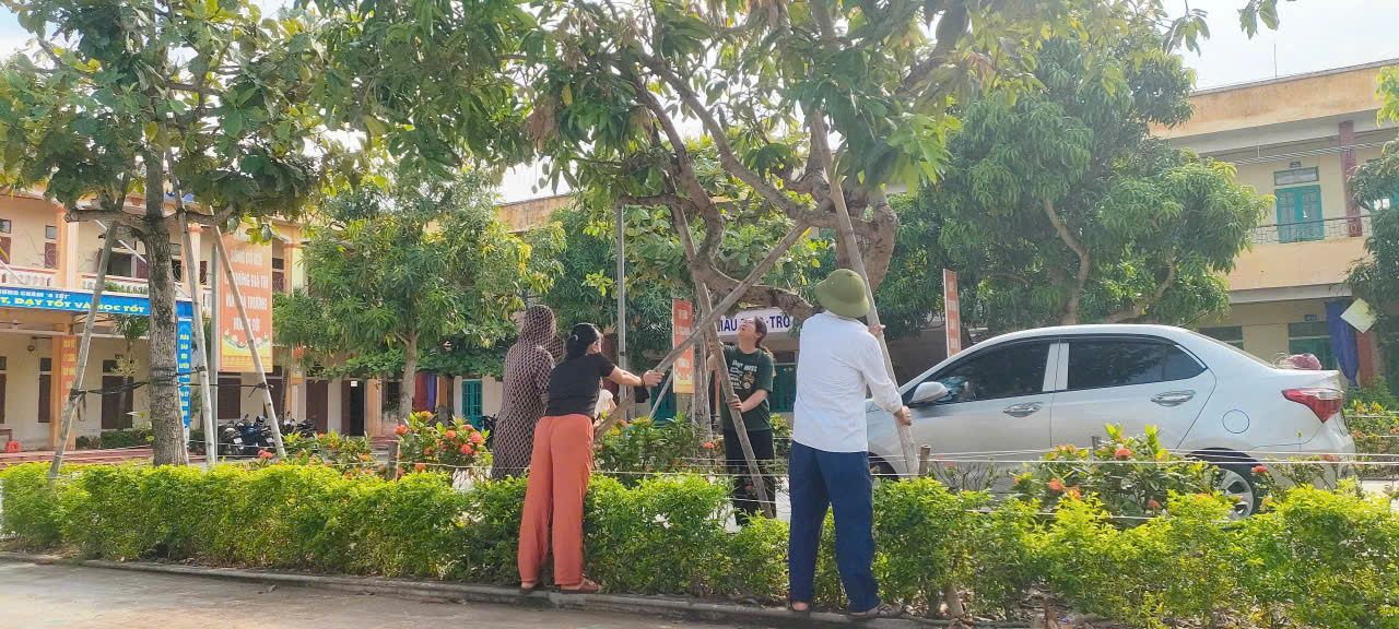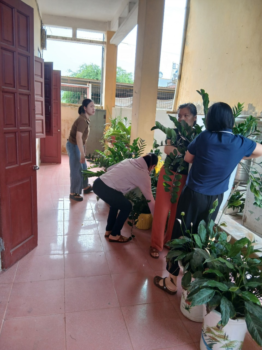 Lãnh đạo nhà trường chỉ đạo chằng chống, gia cố toàn bộ hệ thống cửa sổ, cửa chính các phòng học và phòng chức năng; Sắp xếp, di dời cây cảnh, tháo cờ, thu gọn và bảo quản đồ dùng ngoài sảnh, cuốn bạt che nắng; Chằng chống cây cối, phát quang cành lá toàn bộ hệ thống cây xanh, cây ăn quả trên sân trường; Ngắt toàn bộ nguồn điện tại các phòng học và phòng chức năng.