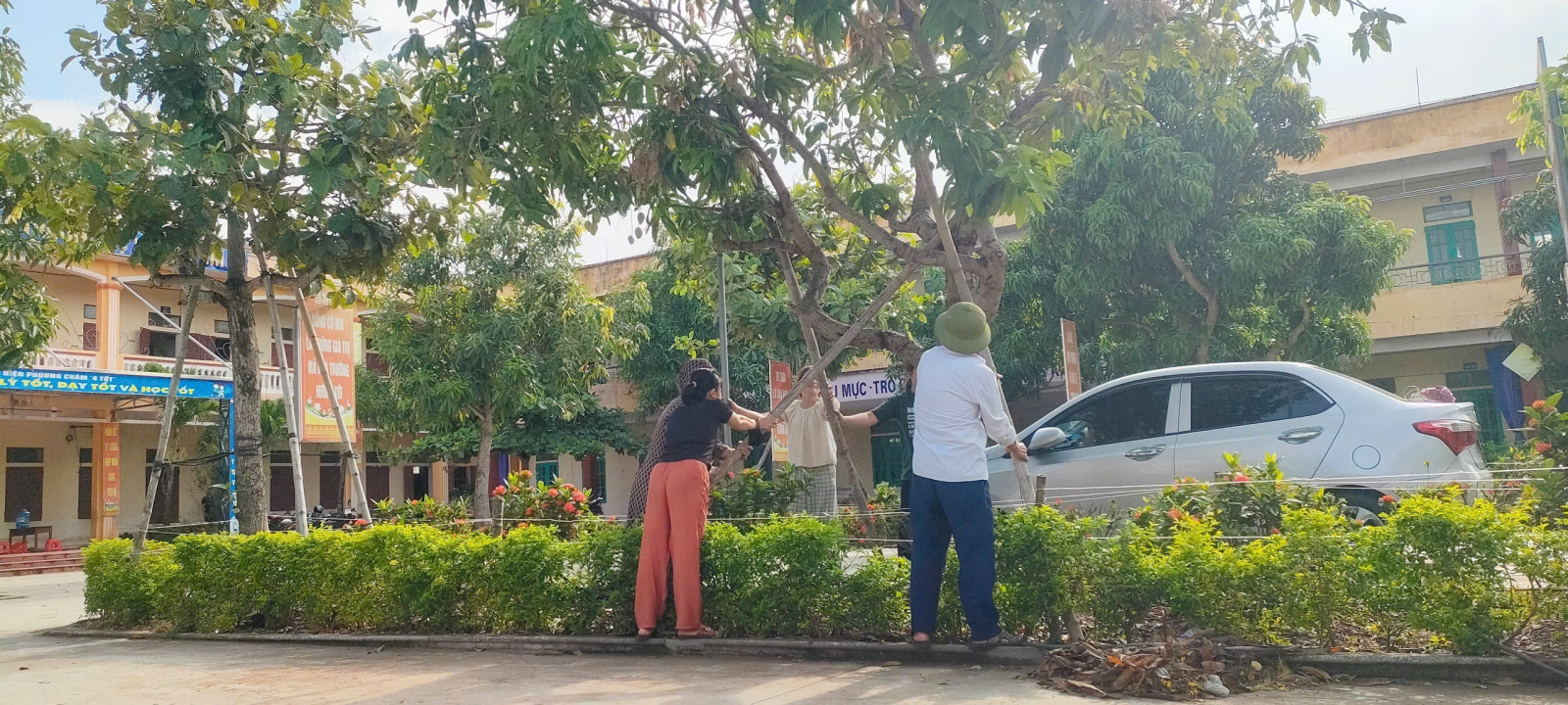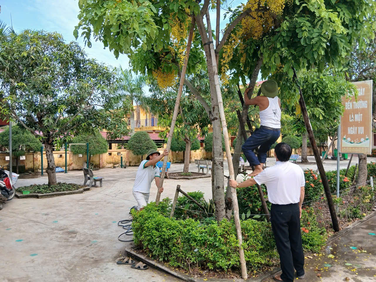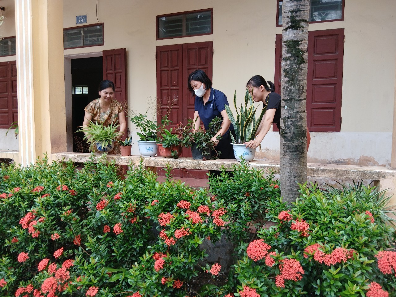 Lãnh đạo nhà trường chỉ đạo chằng chống, gia cố toàn bộ hệ thống cửa sổ, cửa chính các phòng học và phòng chức năng; Sắp xếp, di dời cây cảnh, tháo cờ, thu gọn và bảo quản đồ dùng ngoài sảnh, cuốn bạt che nắng; Chằng chống cây cối, phát quang cành lá toàn bộ hệ thống cây xanh, cây ăn quả trên sân trường; Ngắt toàn bộ nguồn điện tại các phòng học và phòng chức năng.